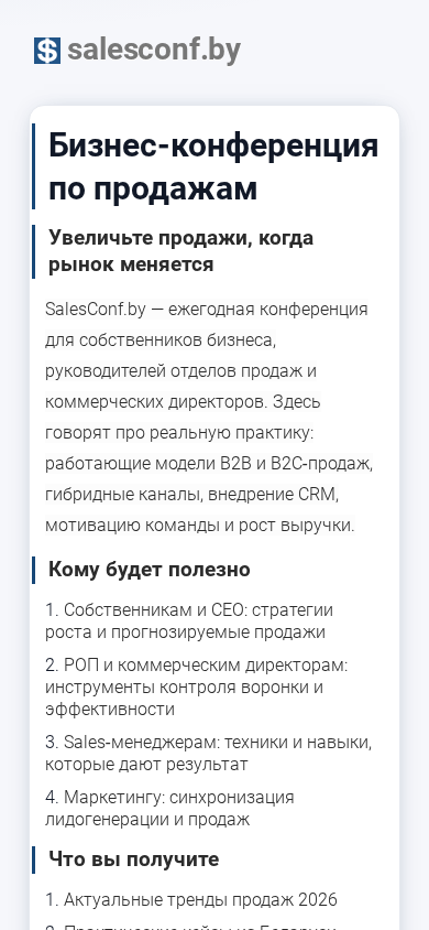 | SEO-описание | Увеличьте продажи, когда рынок меняетсяSalesConf.by — ежегодная конференция для собственников бизнеса, руководителей отделов продаж и коммерческих директоров. Здесь говорят про реальную практику: работающие модели B2B и B2C‑продаж, гибридные каналы, внедрение CRM, мотивацию команды и рост выручки.Кому будет полезноСобственникам и CEO: стратегии роста и прогнозируемые продажиРОП и коммерческим директорам: инструменты контроля воронки и эффективностиSales‑менеджерам: техники и навыки, которые дают результатМаркетингу: синхронизация лидогенерации и продажЧто вы получитеАктуальные тренды продаж 2026Практические кейсы из БеларусиПроверенные инструменты для B2B и B2CНетворкинг с предпринимателями и руководителямиПочему сейчас Рынок становится сложнее, клиенты — требовательнее, а каналы — разнообразнее. |