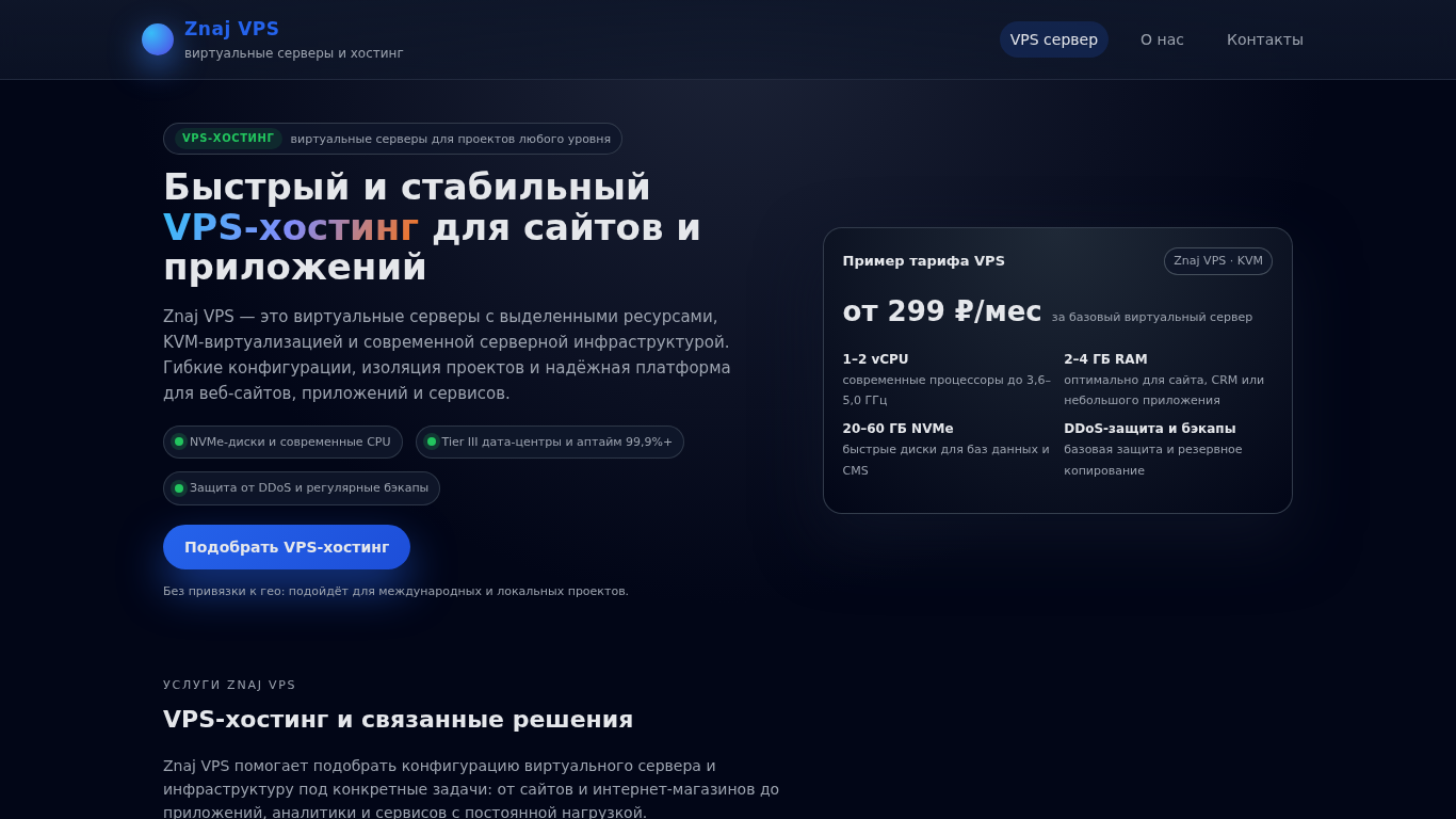 | SEO-описание | Znaj VPS — информационный сайт о VPS‑хостинге. Помогаем выбрать VPS/VDS сервер в аренду, сравнить варианты VPS‑хостинга и инфраструктуру на базе дата‑центров уровня Tier III. |