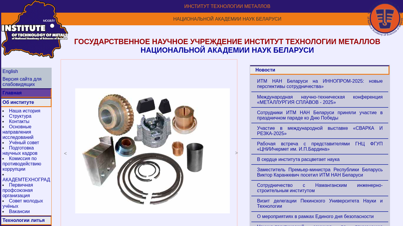| SEO-описание | Институт технологии металлов Национальной академии наук беларуси изготавливает ресурсосберегающее высокотехнологичное оборудование для литья черных и цветных металлов; отливки с улучшенными физико-механическими свойствами: отливки из бронзы и алюминия, отливки из чугуна и стали, биметаллические отливки и др. |