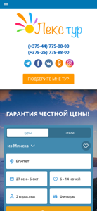 | AI-анализ | Описание: Сайт является онлайн-представлением компании Lex Tour, предлагающей различные туры и информацию о ценах на них. Ключевые слова, связанные с сайтом, включают 'туры', 'цены', 'путешествия', 'компания' и 'Lex'. На сайте можно найти подробные сведения об предложениях компании и контактную информацию, которая отображается как '775-88-00'. |