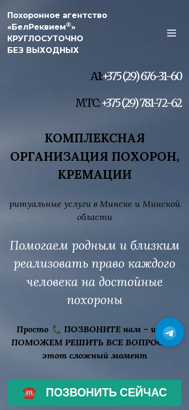 | SEO-описание | Ритуальные услуги в Минске круглосуточно. Похоронное агентство БелРеквием®. ПОМОГАЕМ РОДНЫМ И БЛИЗКИМ РЕАЛИЗОВАТЬ ПРАВО КАЖДОГО ЧЕЛОВЕКА НА ДОСТОЙНЫЕ ПОХОРОНЫ |
