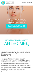 | AI-анализ | The portal plastika.by is dedicated to plastic surgery and reconstructive procedures for facial and body enhancement in Minsk, Belarus. Services include nose surgery (rhinoplasty), consultations, and various methods for facial and body rejuvenation. The website offers both closed and open surgical procedures, as well as non-surgical options. Post-operative scars are not visible. The estimated hospital stay is zero to one day, with a seven to ten-week recovery period for outpatient care. Visitors can select nose reshaping areas, such as cartilage or bone, and upload photos for more detailed consultations. Users are required to input their name with a minimum of two characters and their phone number with a length between seven and twenty-one digits. The format should be in the style of 8(029) 202-03- |