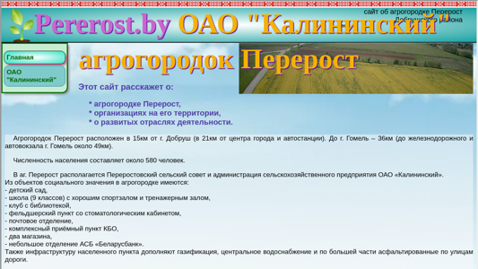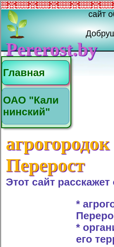 | SEO-описание | Об агрогородке Перерост, его жителях, субъектах хозяйствования, ОАО Калининский, вакансиях, работа по профессиям в сельском хозяйстве |