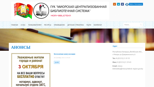 | SEO-описание | Анонсы мероприятий в Миорах - анонсы праздники, творческие вечера миорская библиотека |