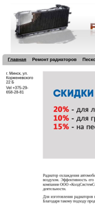 | SEO-описание | Изготовление автомобильных радиаторов различных видов легковых, грузовых автомобилей, а также радиаторов мотоциклов и строительной и спецтехники. Новые технологии по восстановлению радиаторов МАЗ. Действуют скидки! Звоните! |