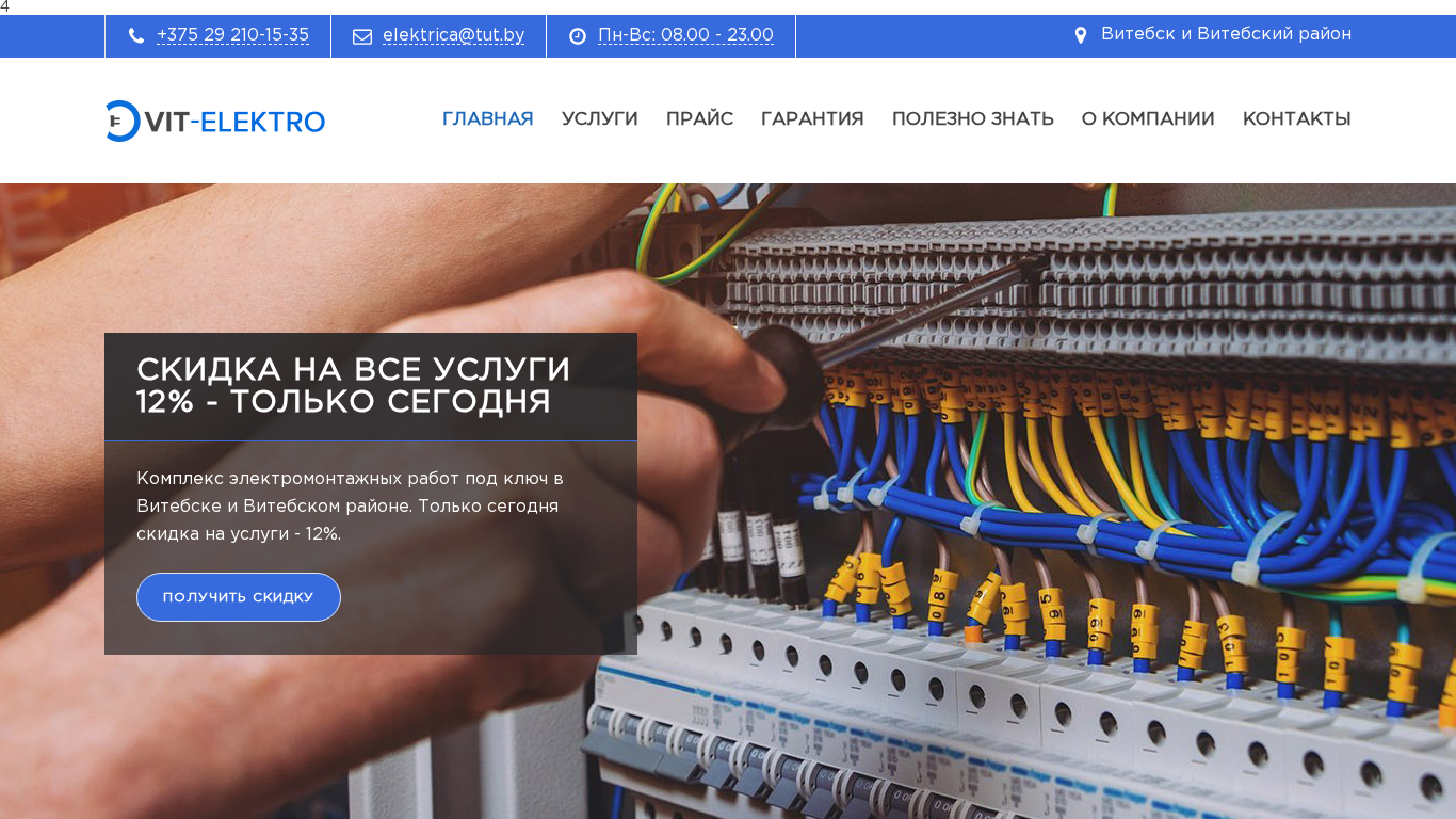 | SEO-описание | Вызвать электрика на дом. Заказать электромонтажные работы в Витебске - оперативно! Работаем в будние дни и в выходные. Гарантия на все работы. Заказывайте на сайте или звоните прямо сейчас: +375 29 210-15-35! |