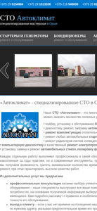 | SEO-описание | СТО «Автоклимат» в г. Орша предлагает профессиональный ремонт стартеров и генераторов на легковые и грузовые автомобили, монтаж и обслуживание автомобильных и бытовых кондиционеров в Орше, ремонт и установку автомобильных стекол и многое другое |