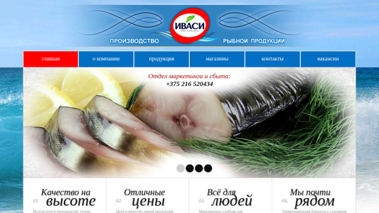 | SEO-описание | Основными видами деятельности компании «Иваси-Плюс» является производство и оптово-розничная торговля свежемороженой, соленой, копченой и вяленой рыбой, рыбными пресервами в различных заливках, соусах, маринадах, а также переработка и консервирование рыбы и морепродуктов. |