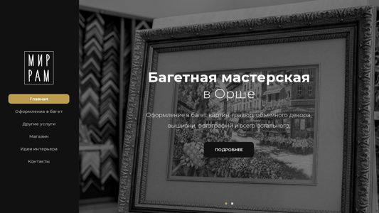 | SEO-описание | Наша багетная мастерская «МИР РАМ» в Орше занимается художественным оформлением и производством интерьерной продукции. |