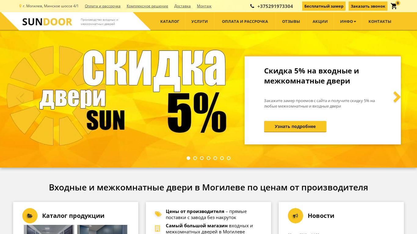 | AI-анализ | This online resource is a shopping website for entry and interior doors located in Mogilev, Belarus. The address is given as g. Mogilev, ul. Miniskoe shosse 4/1. The website offers payment and financing options, delivery and installation services, and a catalog of doors for sale. The main product categories are entry doors and interior doors, with various styles and color options available. The website also mentions discounts, free delivery within Mogilev, and a contact phone number for making a call and arranging a free measurement. The domain name is sundoor.by. |
