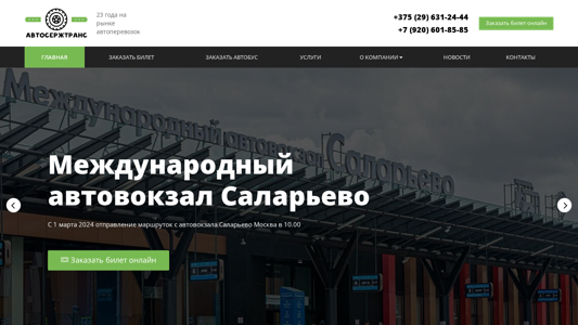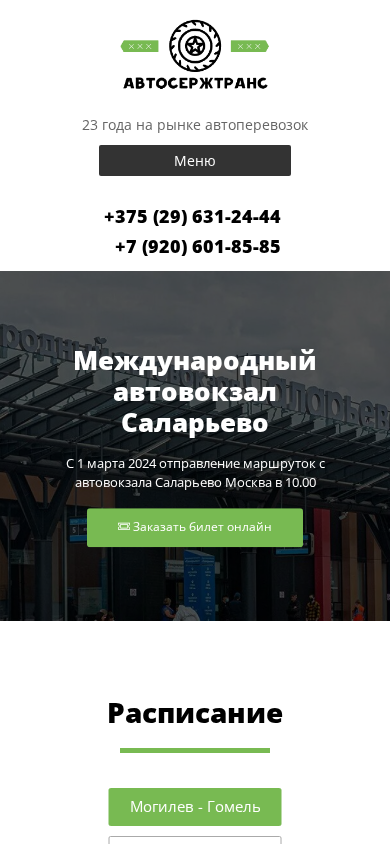 | SEO-описание | ЧПУП АвтоСержТранс - Лидер на рынке автоперевозок в Беларуси! У нас можно заказать автобус или Микроавтобус. Выполняем регулярные рейсы Могилев - Гомель - Могилев, Могилев - Белыничи, Могилев - Киев, Клинцы- Москва, Костюковичи- Москва, Клинцы - Костюковичи- Климовичи- Москва . |