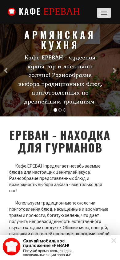 | SEO-описание | Кафе Армянской кухни ЕРЕВАН - это сочетание уютной атмосферы, отличной кухни и заботы о гостях. Вкусные блюда, караоке, шоу программа! Оперативная доставка блюд на дом и в офис. |