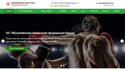 | SEO-описание | Общественное объединение Могилевская областная федерация бокса приглашает юношей и девушек Могилева и Могилевской области стать членом команды по боксу. Школы бокса и адреса. |