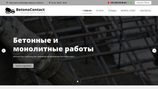 | SEO-описание | Выполняем все виды бетонных работ для дома и прочих сооружений на территории Могилева и Могилевской области. Звоните рассчитаем стоимость заливки бетона под Ваш объект. Выполняем максимально оперативно, соблюдая оговоренные сроки по договору. |