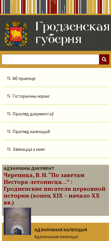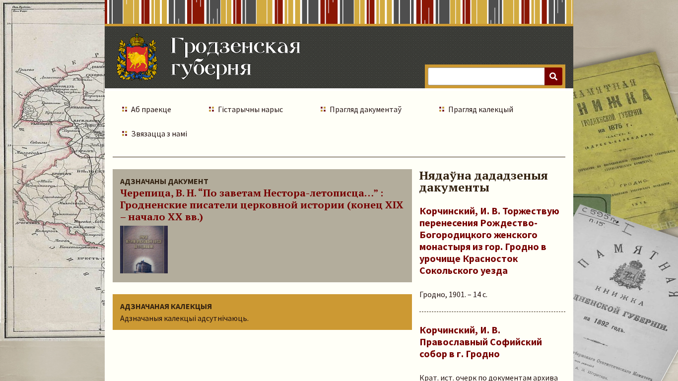 | SEO-описание | Гродзенская губерня існавала ў 1801-1921 гг. Адміністрацыйны цэнтр – горад Гродна. Тэрыторыі, якія займала губерня, былі далучаны да Расійскай імперыі ў выніку 3-га падзелу Рэчы Паспалітай (1795 год). Першапачаткова былі ўтвораны Слонімская і Віленская губерні (намесніцтвы), якія ў 1797 годзе былі аб’яднаныя ў Літоўскую губерню. У 1801 годзе яна была падзелена на Віленскую і Слонімскую, а ў 1802 годзе перайменаваную ў Гродзенскую.<br /> <br /> У БД “Гродзенская губерня” адлюстраваны дакументы аб палітычным, сацыяльна-эканамічным і культурным жыцці Гродзенскай губерні. Уключаны асобныя выданні і артыкулы з іх на беларускай, рускай і польскай мовах, выдадзеныя ў 1801-2020 гадах. Гэта першая спроба рэгістрацыі прац аб жыццядзейнаці губерні. |