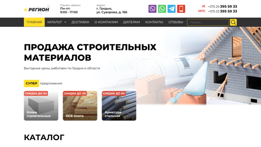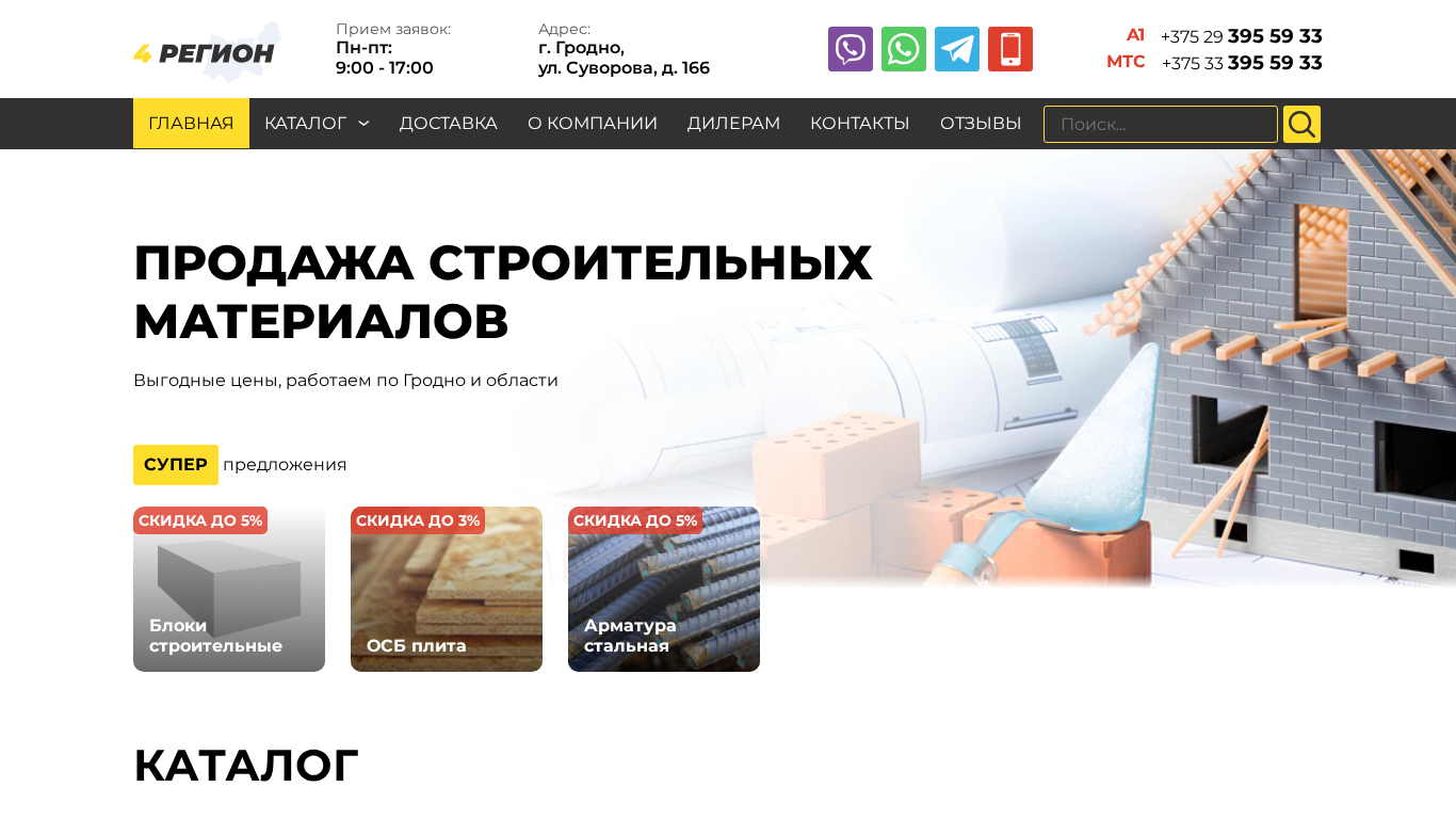 | SEO-описание | Купить строительные материалы в Гродно в магазине 4Регион. Широкий ассортимент, выгодные цены, профессиональный расчет, доставка по городу и области. |