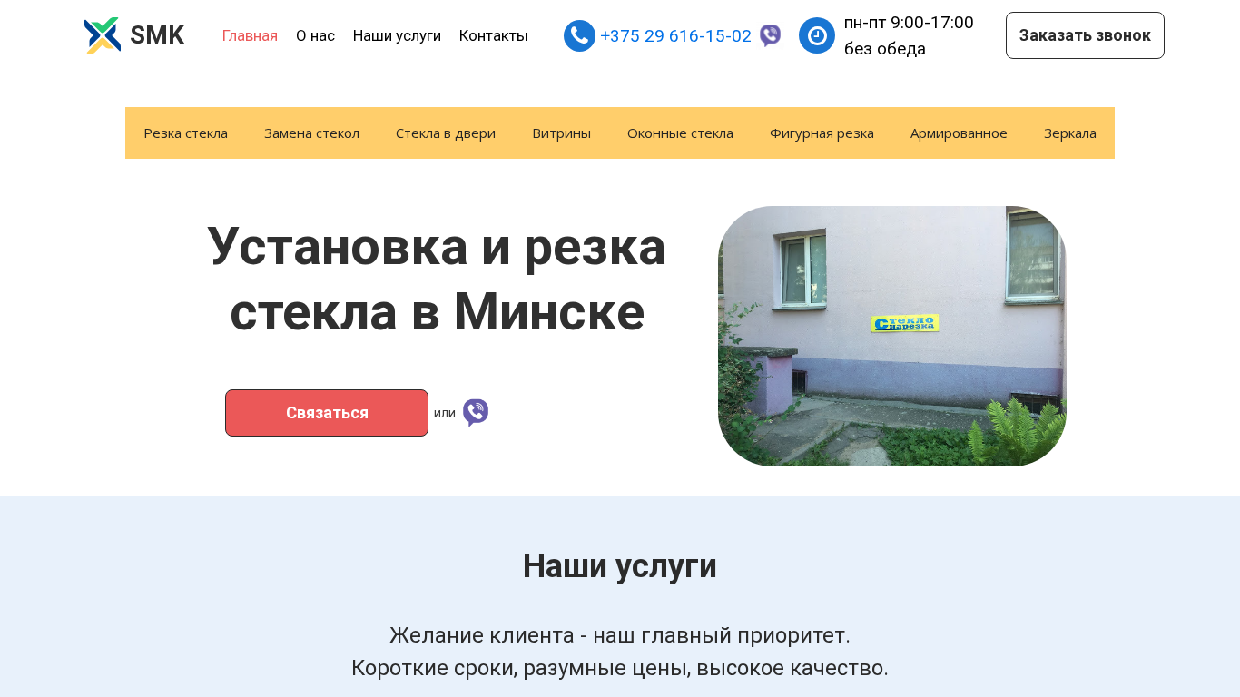 | SEO-описание | Резка и обработка стекла с последующей установкой в Минске. Ищите где можно вырезать стекло по размеру? Купить и установить стекло можно у нас +375 29 616-15-02. |