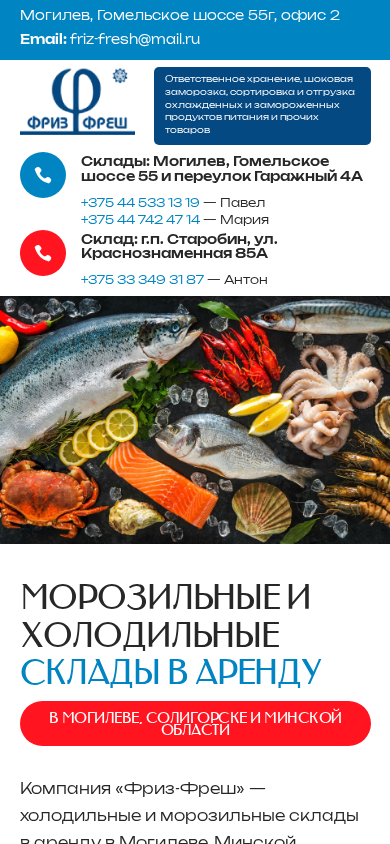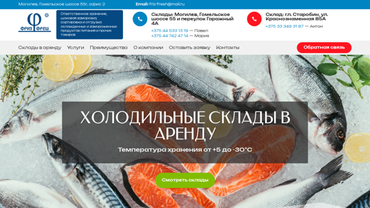 | SEO-описание | Компания «Фриз-Фреш» - холодильные и морозильные склады в аренду в Могилеве, Минской области и Солигорске. Температура от +5 до -30 °C. |