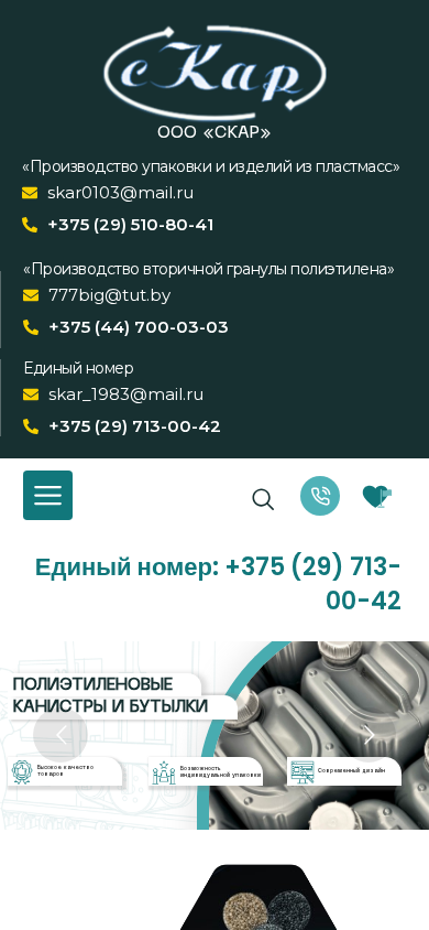 | SEO-описание | Компания Скар - производим пластиковую тару и полимерную упаковку в Беларуси оптом ✅Доставка по всей Беларуси ✅Современный дизайн ✅Высокое качество товаров |