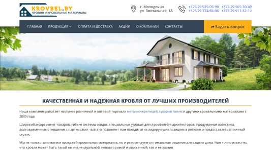 | SEO-описание | Кровельные материалы и комплектующие по доступным ценам в Молодечно, Сморгони, Вилейке, Островце, Воложине, Мяделе, Ошмянах, Логойске с доставкой. Скидки и специальные условия. |
