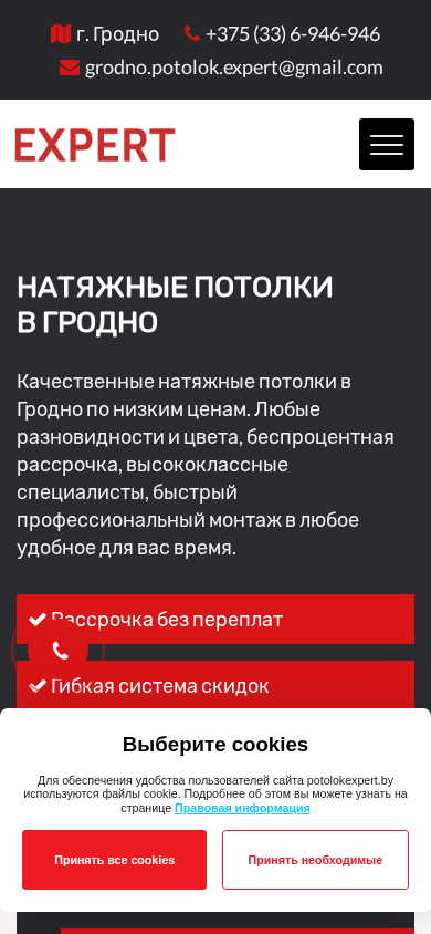 | SEO-описание | Натяжные потолки в Гродно: Низкие цены✓ Беспроцентная рассрочка✓ Гарантия 15 лет✓ Быстрые замеры и монтаж✓ ☎ +375 (33) 6-946-946 |