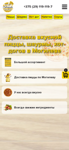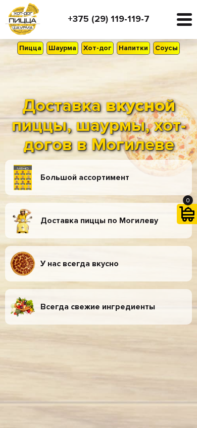 | SEO-описание | Доставка вкусной 🍕 пиццы, 🌭 хот-догов и 🌯 шаурмы в Могилеве. При заказе от 25р – бесплатная доставка! ☎ +375 (29) 119-119-7. |