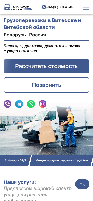 | SEO-описание | Грузоперевозки по Витебску, области и междугородние рейсы (Беларусь-Россия) 24/7. Квартирные, офисные и дачные переезды от 30 руб. Вывоз мусора. Доставка стройматериалов, мебели, бытовой техники. Услуги грузчиков, демонтаж.Работаем быстро и надежно! Звоните! |