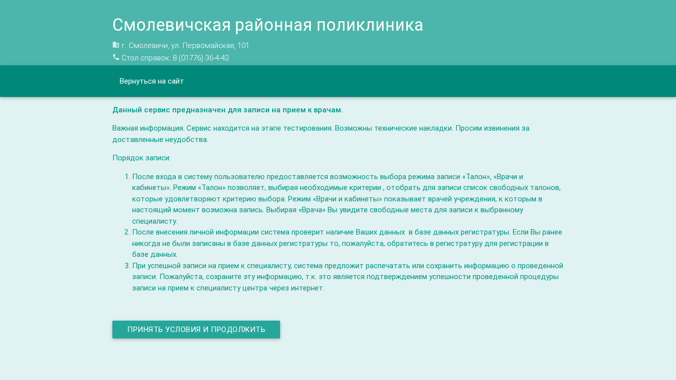 | Название / Заголовок | Смолевичская районная поликлиника. Заказ талонов |