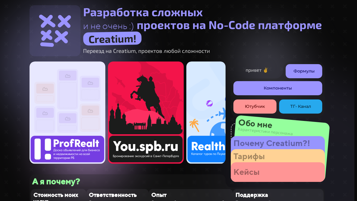 | SEO-описание | Необходимы надежные и сложные веб-сервисы/приложения за чучуть денег и маленечко времени? Не знаете, как перенести сайт на платформу Creatium или сделать его идеально адаптированным для разных устройств? Я, я, я - помогу со всем этим!