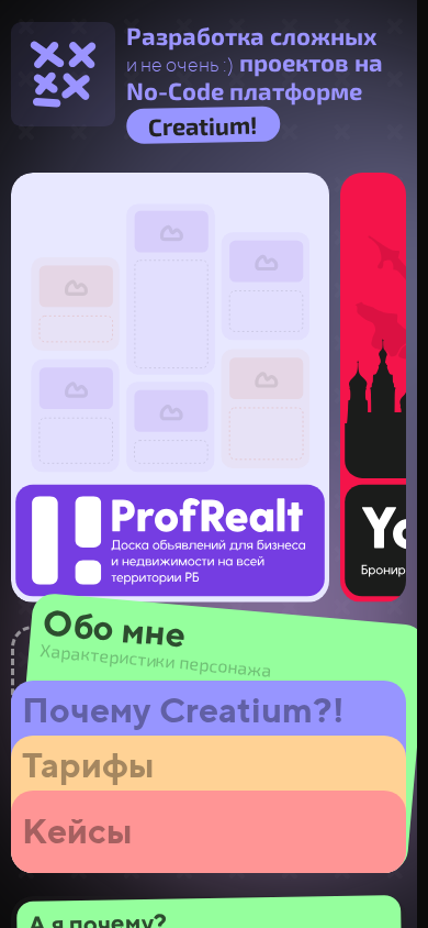 Занимаюсь full-stack разработкой, ребрендингом и переносом веб-сайтов на Creatium. Быстро, недорого и без хлопот — вам останется только наслаждаться результатом! |