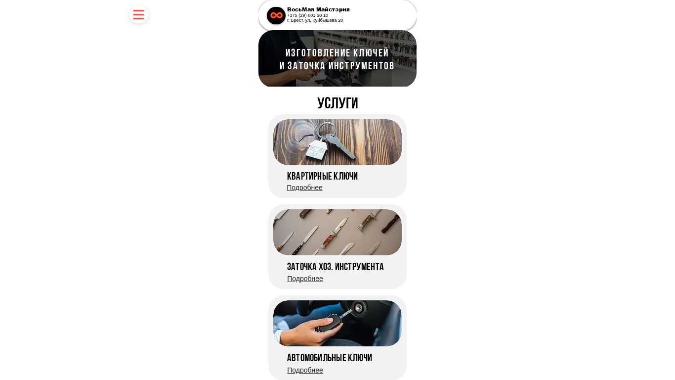 | SEO-описание | Мастерская по изготовлению ключей в Бресте. Квартирные и автомобильные ключи, заточка инструмента, замена батареек, домофонные чипы | ВосьМаяМайстэрня |