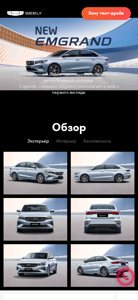 | SEO-описание | Купите Geely Emgrand у официального дилера в Беларуси ➤ Обзор Джили Эмгранд: экстерьер и опции автомобиля ➤ Выгодные условия по кредиту и лизингу 🏁 Приглашаем на тест-драйв ➤➤ Запись онлайн на geely.by. |