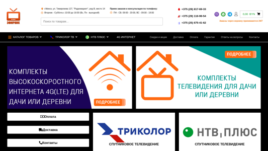 | SEO-описание | Наш интернет-магазин занимается продажей товаров для ТВ, подключением 4G интернета, спутникового ТВ (НТВ-Плюс, Триколор, Телекарта). Лучшие цены и подарки! |